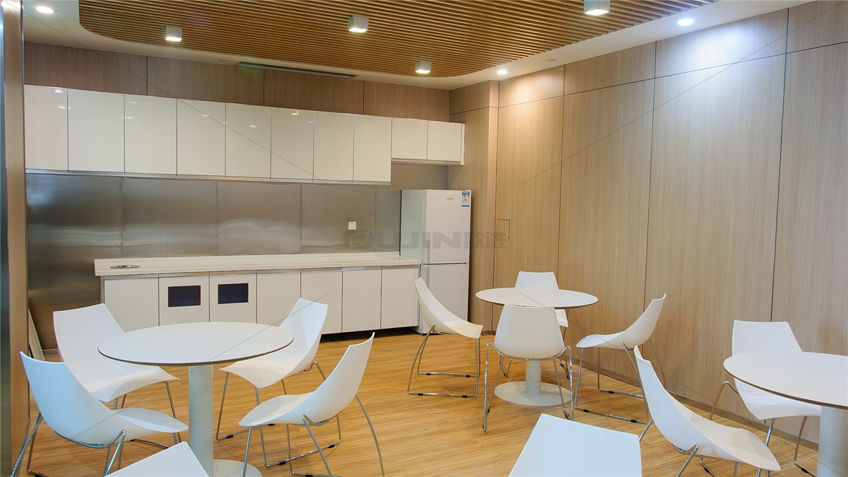 茶水間的宗旨是為創意人士提供一個創意及休息的工作平臺,而非我們通常所熟知的辦公類型。旁邊定制了茶水臺及茶水吊柜。在一個獨特的空間里混合布局了公共休閑空間與休息的區域。休閑茶水區配有冰箱、咖啡機、微波爐的廚房設施、以及精美的小零食點心之類食品。充分體現了公司對員工的人文關懷,處處為員工著想的企業文化。